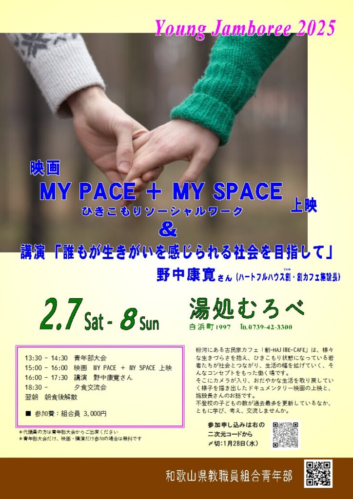 毎年恒例のヤングジャンボリー、今年は白浜で行います。ひきこもり状態になっている青年たちを支援している創(はじめ)カフェを舞台にしたドキュメント映画の上映会と、その施設長である野中さんのお話をうかがい、不登校についてともに学び、考えます。また、この機会に県内教職員の交流を広げましょう。