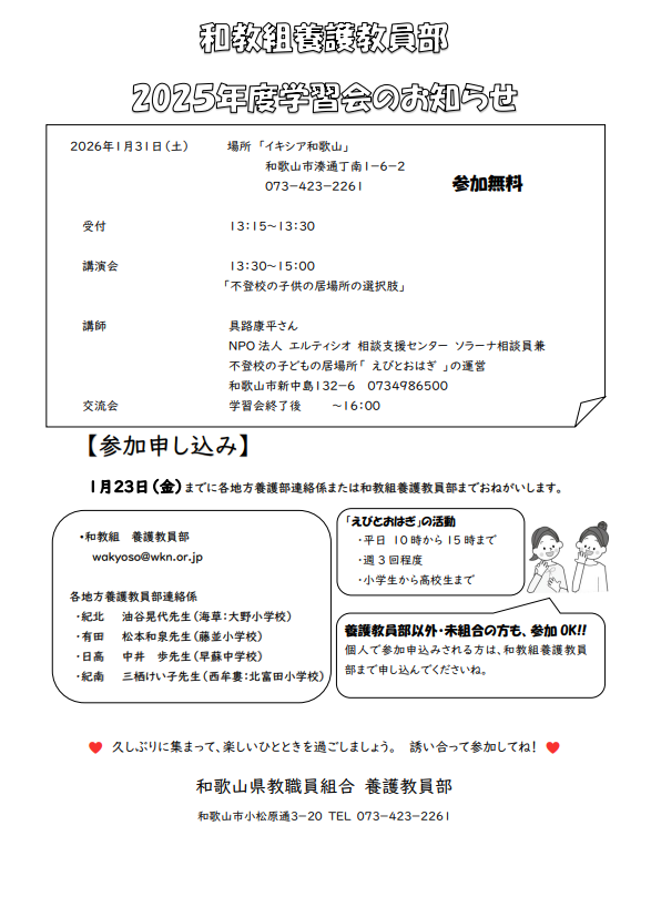 不登校の子どもの居場所「えびとおはぎ」の活動の様子や、子どもたちの様子をうかがい、ともに考えます。ぜひお越しください。